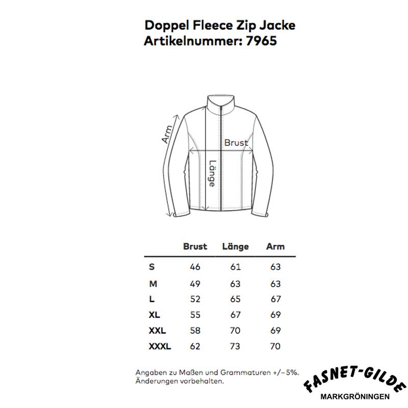 Veredelung: Einzelname auf der Vorderseite Brust, Fasnet-Gilde Markgröningen Schriftzug auf der Rückseite gestickt.